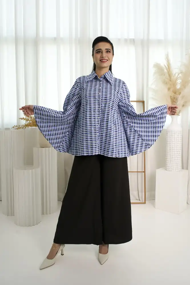 Elevate your everyday lookwith Kimono Top, designed with stylish flare sleeve cut that adds graceful movement with every step. The structured pointed collar creates a modern and polished apprearance, making this piece perfect for both casual and dressy occasion.