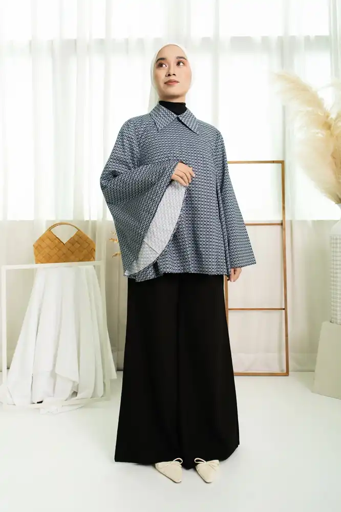 Elevate your everyday lookwith Kimono Top, designed with stylish flare sleeve cut taht adds graceful movement with every step. The structured pointed collar creates a modern and polished apprearance, making this piece perfect for both casual and dressy occasion.