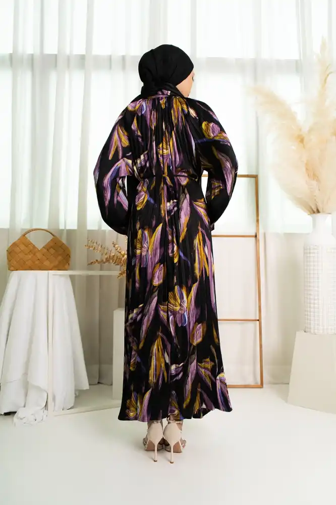 This kaftan dress features a bold abstract print in vibrant tones. Designed with loose, relaxed silhouette, it drapes beautifully on all body shapes, offering both comfort and elegance in one look. The high neckline with subtle gathers adds a refined touch, while the cuffed sleeves give structure to the free-flowing design.