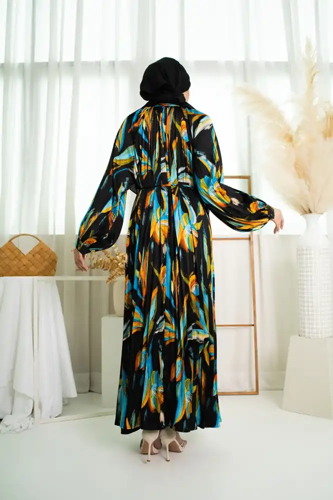 This kaftan dress features a bold abstract print in vibrant tones. Designed with loose, relaxed silhouette, it drapes beautifully on all body shapes, offering both comfort and elegance in one look. The high neckline with subtle gathers adds a refined touch, while the cuffed sleeves give structure to the free-flowing design.