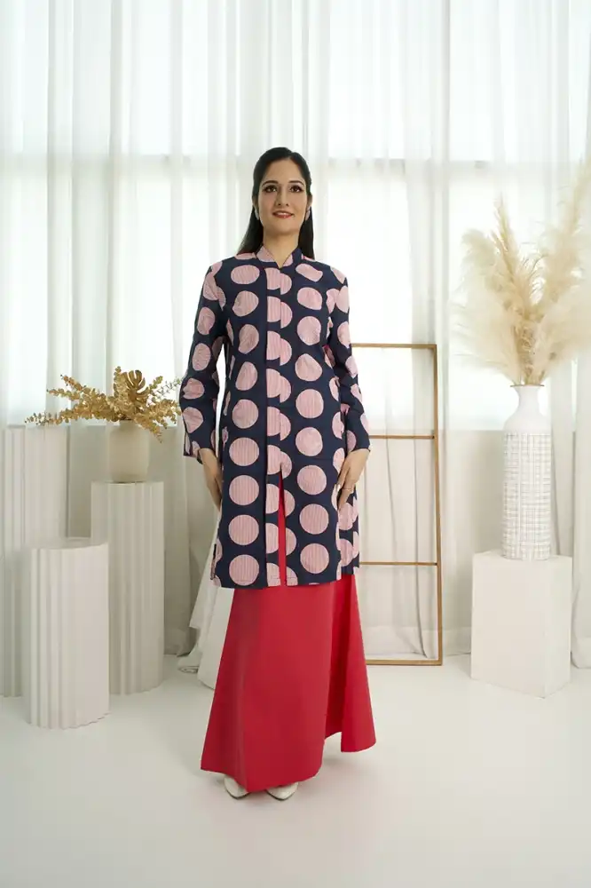 Introducing Baju Kurung Polka Pop - a playful yet stylish piece inspired by retro pop patterns. The top features oversized polka dots insoft pastel pink against a deep navy base, creating a bold contrast that is eye-catching and youthful. The silhouette is designed in a modern straight kurung cut, structured yet relaxed for everyday comfort.