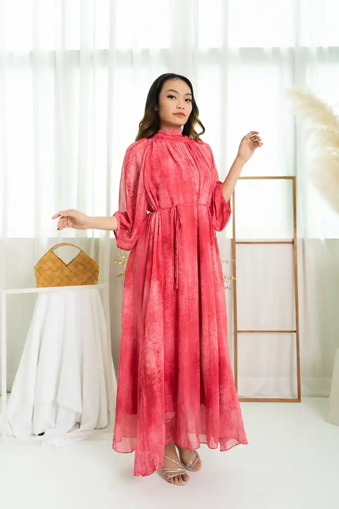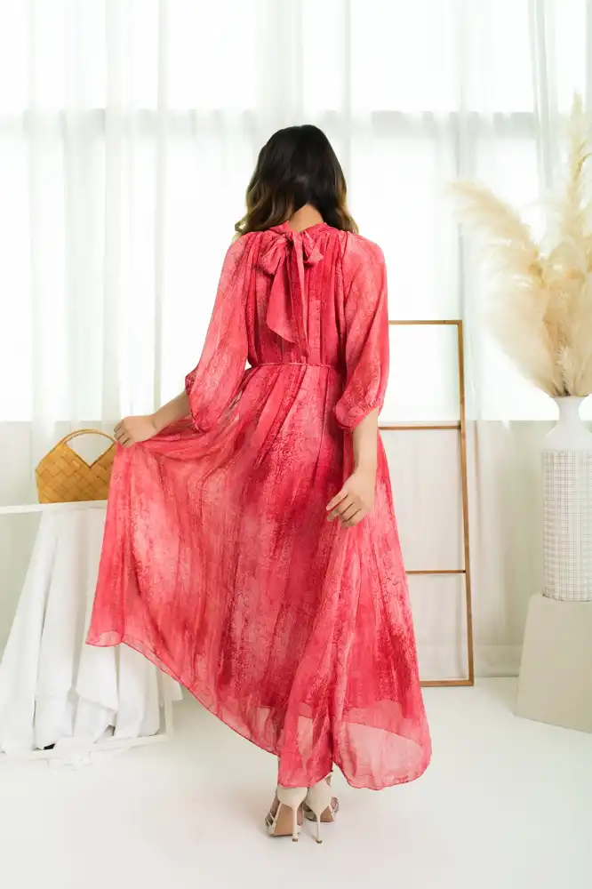 This one piece dress features a relaxed flowy silhouette that suits all body shapes. Designed with a self-tie ribbon at the back neckline, adding a soft feminine touch. The crinkle chiffon febrics moves beautifully with every step, creating an effortless and gracefully.